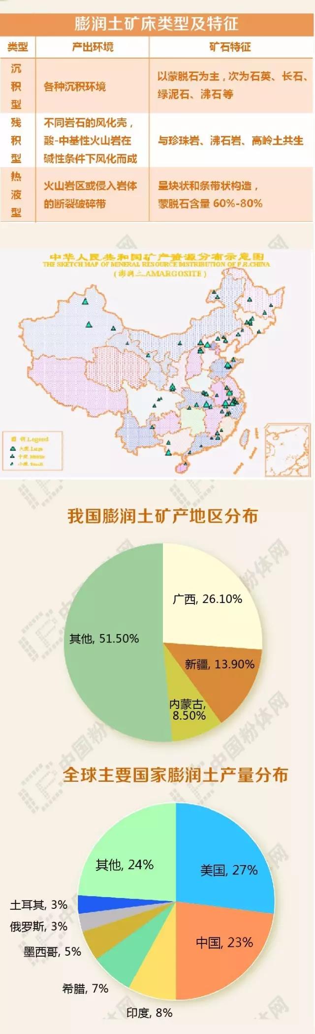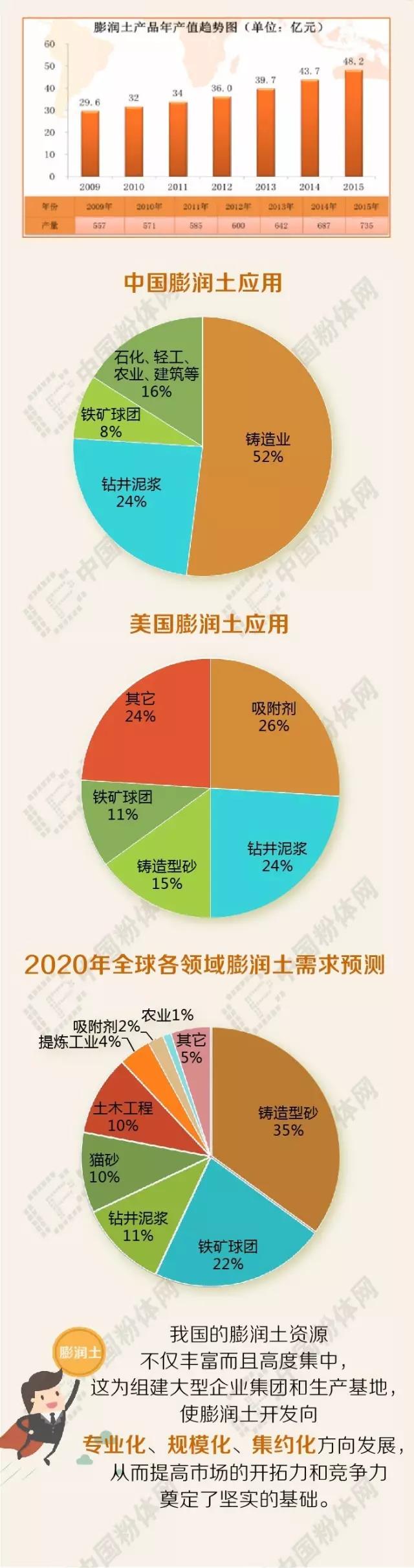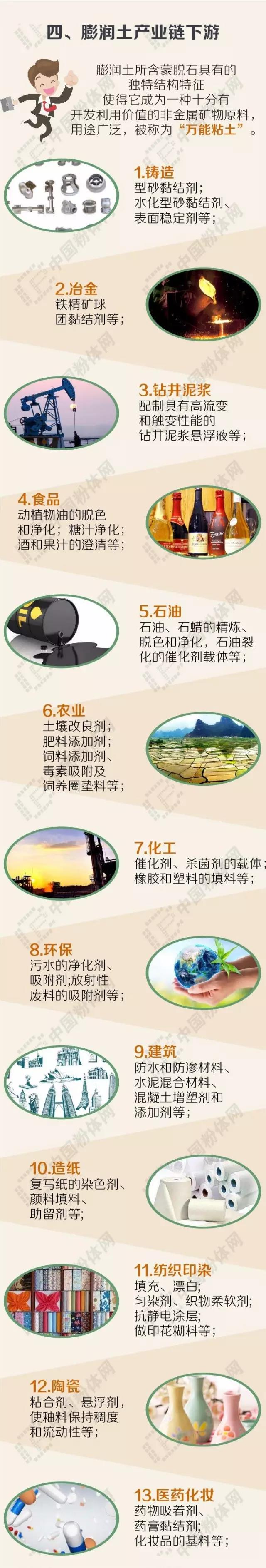 膨潤土是一種開發(fā)應用較廣泛、具有較高經(jīng)濟價值的非金屬礦資源。由于兼具吸附性、離子交換性、遇水膨脹等性能,膨潤土在工農(nóng)業(yè)生產(chǎn)24個領域的100多個部門中均有應用,素有“萬能黏土”之稱,與膨潤土有關的產(chǎn)品多達100個以上。